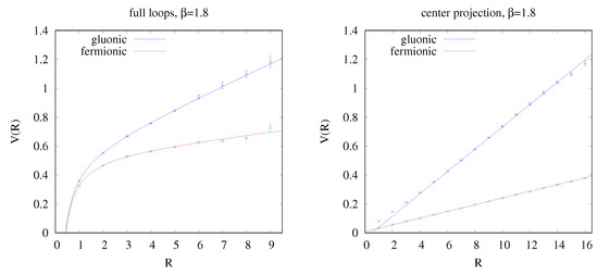 The fermionic back reaction on the string tension is clearly observed in the full theory as well as for EaMCG (Ensemble averaged Maximal Center Gauge), where the link variables of the gauge field are projected to . The potentials for the gluonic and fermionic configurations are depicted in Figure 6 and compare the full SU(2) theory with the theory. The string tension was extracted by fitting the respective Equation (3) or (4) to the data describing the potential. The resulting parameters of these fits are given in Table 3. The relevant parameters to compare are and .