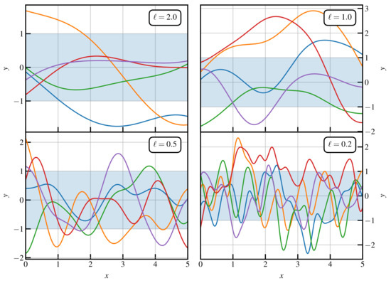 A simple way to understand GP is to make use of Bayes’ theorem. Before doing the experiments we have a prior distribution of , characterised by the kernel given in Equation (2). We can then draw sample functions from this prior, which are fully determined by the parameters . In Figure 1, we show five sample draws of functions from some priors, which have and various choices of ℓ. We observe that by varying ℓ, we can have very different shapes in the prior samples. On average, they all lie within the shaded area representing the confidence interval 68% of the time.