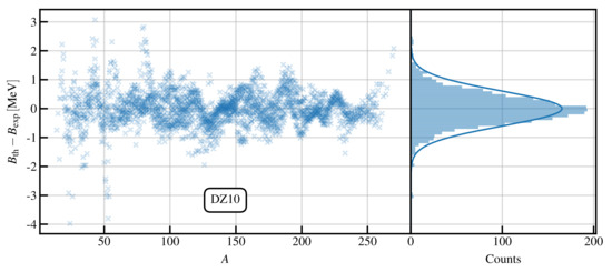 where is the binding energy calculated using DZ10. In Figure 3, we illustrate the residuals for DZ10 as a function of the nucleon number . One clearly sees that these residuals show structure, thus indicating the presence of some missing physics that is not properly accounted for by the model. In the right panel of the same figure, we plot the same residuals as a histogram, and we draw a Gaussian with mean 0 and width fixed to the RMS of the residuals. The height of the Gaussian is fitted on the residuals.
