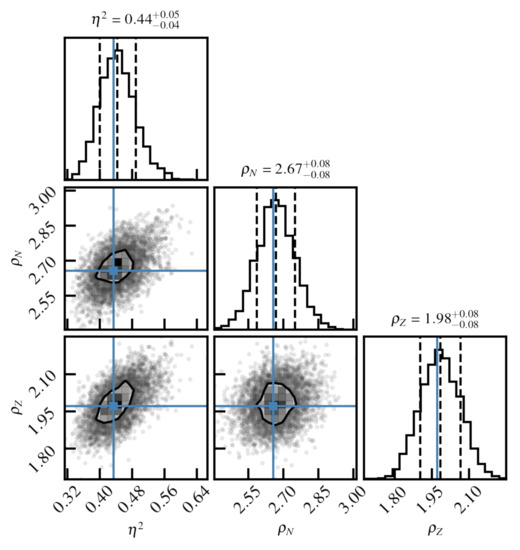 As discussed previously, we adjust the parameters of the GP on the residuals of the DZ10 model (shown in Figure 3). The parameters are determined through maximising the likelihood for the GP. See Ref. [31] for details. In Figure 4, we illustrate the posterior distribution of the parameters in the form of a corner plot. The distributions were obtained with Markov chain Monte Carlo (MCMC) sampling [42]. The plot illustrates the shapes of the distributions around the optimal parameter set and provides us with error bars for the parameters and information about their correlations. In this case, we see that all parameters are very well determined by the residuals data, and a weak correlation is observed between and and between and .