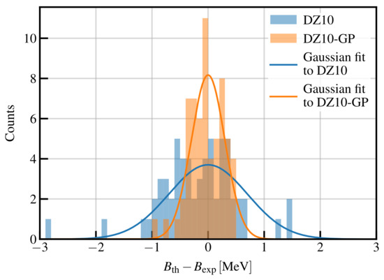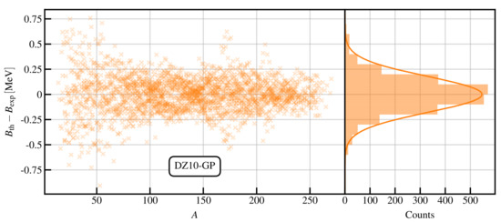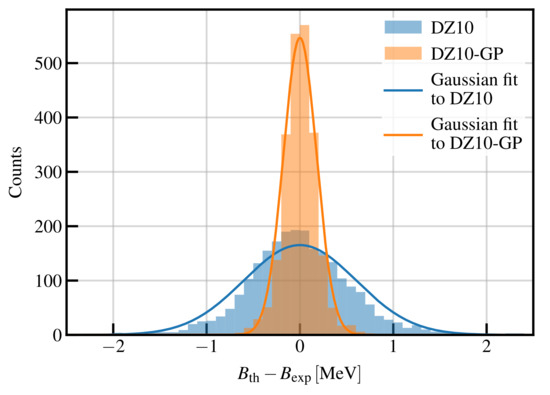 We now construct our new model for (appearing in Equation (3)) as , which we name DZ10-GP. In Figure 5, we compare the residual distributions for the DZ10 and DZ10-GP models for measured masses. We see that the RMS of the DZ10 model has been greatly reduced. The total RMS of the DZ10-GP model is keV, which until now is probably among the lowest values ever obtained using a mass model fitted on all the available masses, with a total of adjustable parameters. It is worth stressing that, contrary to a standard mass model that relies on several hypotheses in order to describe the data, the GP takes information directly from the data, and therefore, the dataset is an important ingredient of the model. Consequently, the number of parameters quoted here should not be directly compared with that of a standard mass model.