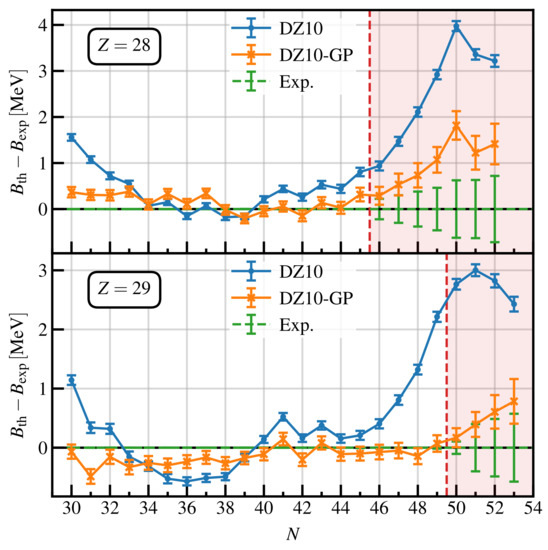 In Figure 10, we report the distribution of the residuals for the new isotopes presented in AME2020 database, apart from the Cu measurements already published in Ref. [46]. We observe that the RMS of the original DZ10 model for these new data is keV, while for the DZ10-GP model, it is keV. Notice that in this case, we do not readjust the GP model over the new data. This test clearly proves that the GP is not overfitting the data, but it was really able to grasp a signal in the residuals and is therefore capable of performing extrapolations in regions in the proximity of the dataset used for the training. We also observed that 50% of the new isotopes fall within the error bars of the original DZ10-GP model. This value is slightly lower than what is reported in Table 1, but still reasonable compared to the expected 68%.