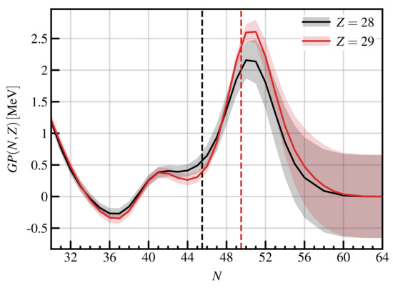 By using a Gaussian process fitted to the residuals of the Duflo–Zucker mass model, we have been able to create a mass model with a global RMS of less than 200 keV. The resulting DZ10-GP model has the major advantage of having a very limited number of parameters (ten in the original DZ model plus four for the GP), but it is also one of the very few mass models equipped with error bars [34,51]. The values of the mass table are available in the Supplementary Material.