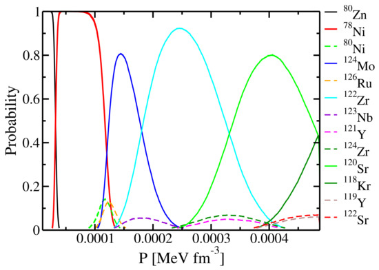 In Figure 11, we show the evolution of the existence probability for each nucleus in the outer crust as a function of the pressure of the star. We notice that, as confirmed by other authors [44], the favourable configurations are those close to the neutron shell closures at and . However, due to the large error bars, there is a non-negligible probability for several nuclei to be present within the outer crust.