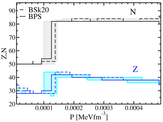 Variations of Z and N with pressure in the outer crust for the BSk20 and BPS models. The shaded area represents the regions covered by the Monte Carlo procedure detailed in the text and obtained using the DZ10-GP model. See text for details.