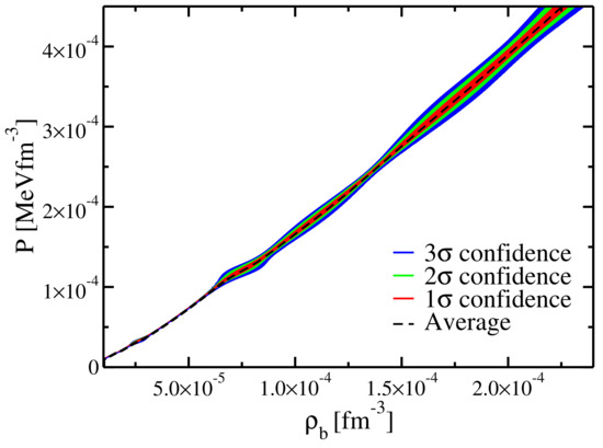 Using the same dataset, we also define a statistical uncertainty for the EoS: by counting the EoS built before, we define the 68%, 95%, and 99% quantiles of the counts, i.e., , , and deviations, under the assumption that the errors follow a Gaussian distribution. The results are presented in Figure 13. We observe that the largest uncertainties are located close to the transition from N = 50 to N = 82 at and approaching the transition to the inner crust at .