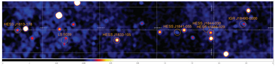 - HESS Collaboration; Abdalla, H.; Abramowski, A.; Aharonian, F.; Ait Benkhali, F.; Angüner, E.O.; Arakawa, M.; Arrieta, M.; Aubert, P.; Backes, M.; et al. The H.E.S.S. Galactic plane survey. Astron. Astrophys. 2018, 612, A1. [Google Scholar] [CrossRef]