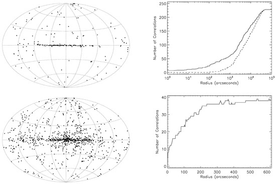 (Left) The distribution of TeV (upper) and INTEGRAL sources (lower) showing the galactic plane clustering. (Upper right) The number of TeV-INTEGRAL spatial correlations (solid curve) and the same for a ‘fake’ set of TeV sources with positions mirrored in latitude and longitude (dashed). (Lower right) The difference between the two curves showing the number of ‘excess’ correlations.