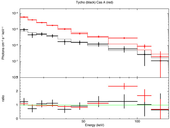 Figure 3 compares the INTEGRAL/ISGRI spectra of the Tycho and Cas-A SNR in the 20–150 keV band summing the data related to all observations performed during the first 1500 satellite orbits. For Tycho (black points in Figure 3) a simple power law with photon index = 2.2 ± 0.5 and a 20–150 keV flux of 1.2 × 10 erg cm s, fits reasonably well the high energy spectrum (errors in Figure 3 and elsewhere include statistical and systematic uncertainties). However, in the case of Cas-A (red points in Figure 3), a steeper power law of = 3 ± 0.1 (20–150 keV flux of 4.9 × 10 erg cm s) is insufficient to fit the data mainly due to the presence of a significant excess around 70–90 keV, which we attribute to the presence in the source of Titanium-44 (44Ti) decaying lines, likely located at 68 and 78 keV. Indeed, the addition of a single Gaussian line is highly required by the data at a significance level greater than 99.99%, but with the data used in the present work we are not able to fully characterise the 44Ti line complex, due to the poor energy resolution of the average IBIS spectra.