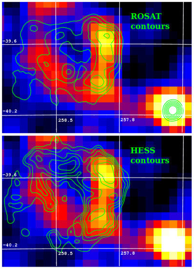 Colour-coded image of RX J1713.7−3946 in the 17–60 keV energy band obtained with INTEGRAL/IBIS with superimposed in green the surface brightness contours in the soft (0.1–2.4 keV) X-ray band mapped with ROSAT (top panel) and in TeV gamma-rays obtained with the H.E.S.S. telescope (bottom panel). The coordinates are in RA/Dec. INTEGRAL picture of the month for April 2008 (https://www.cosmos.esa.int/web/integral/pom-archive, accessed on 3 May 2021) and Krivonos et al. [17]).