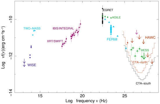 The spectral energy distribution of LS5039 using non-simultaneous data and showing the sensitivity expected from the southern (black line) and northern (orange line) CTA observatories for 50 h (black lines, from https://www.cta-observatory.org/science/cta-performance/, accessed on 3 May 2021). From low to high energy, the data used are from the: 2Mass survey (blue light points) [62], WISE (purple points) [63], EGRET catalog (black points) [66], AGILE catalog (green points) [67], Third Fermi catalog (blue light points) [68], HAWC (orange points) [46], and HESS (green points) [69].