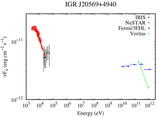 The INTEGRAL/IBIS spectrum of LS 5039 is fitted with a power law with and F 7 × 10 erg cms. Residuals that are plotted in Figure 6 show a break at ∼50 keV. For this reason, we use a broken power law model to better fit these data; the results are reported in Table 4. We build the SED in a broad energy range and plotted it in Figure 7. From low to high energy, data are from the 2Mass survey [62], WISE [63], SWIFT/BAT catalogs [64,65], EGRET catalog [66], AGILE catalog [67], Third Fermi catalog [68], and HAWC [46]. The SWIFT/XRT spectrum is extracted from an observation started on 2011-09-30T20:37:08 UTC, in photon count mode, in a 20 pixel radius circle. Table 4 reports the XRT/SWIFT fit results.