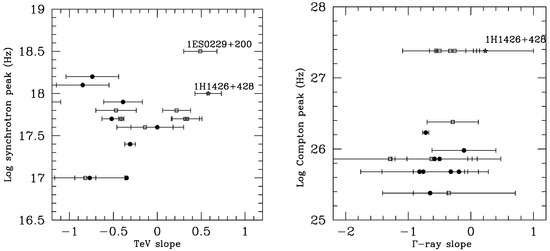 Where the extra objects discussed in Foffano et al. [123] have been plotted for comparison, all of our sources belong to the subclass of typical HBL, with the only exception of 1H 1426+428, as is evident in Table 5 and Figure 9. This source is unique, as its synchrotron peak is located above 100 keV, even if the source is in a low flux state [129], making it a very rare case of a hard-TeV BL Lac, as only four more such cases are known to date. It is worth noting (see Figure 9, right panel) that in the Compton peak versus soft -ray slope diagram the discrimination between typical and hard-TeV objects is more pronounced, which makes this diagram a more useful one to highlight the most extreme high energy peaked BL Lac objects.