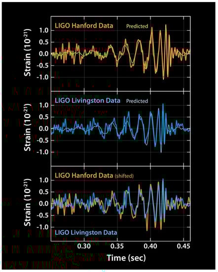 Plots of the first signal of GWs observed by the two LIGO detectors. The top two panels show data received at LLO and LHO and the waveform calculated, taking GR into account. The X-axis represents the time, and Y-axis represents the strain. Strain implies the slight variations in the distances. The bottom plot compares data from both detectors. There is a variation in the orientation of the instruments at the two sites. Therefore, LHO data have been inverted for comparison. There is also a shift in data to include the GW signals’ travel time between Livingston and Hanford (Courtesy Caltech/MIT/LIGO Laboratory) [].