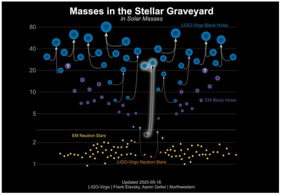 - Abbott, B.P.; Abbott, R.; Abbott, T.D.; Abraham, S.; Acernese, F.; Ackley, K.; Adams, C.; Adhikari1, R.X.; Adya, V.B.; Affeldt, C.; et al. Observation of a Compact Binary Coalescence with Total Mass ∼ 3.4 M⊙. Astrophys. J. Lett. 2020, 892, L3. [Google Scholar] [CrossRef]