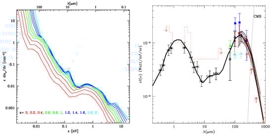 (Left): the energy-weighted proper number density of EBL photons as a function of the energy . The various curves correspond to different redshifts, as indicated. The contributions of CMB photons appear in the fast rise below 0.01 eV. (Right): the corresponding EBL spectral intensity (thick line). The data-points correspond to the integration of the known-source number counts as in Equation (2). (Taken from [82]).