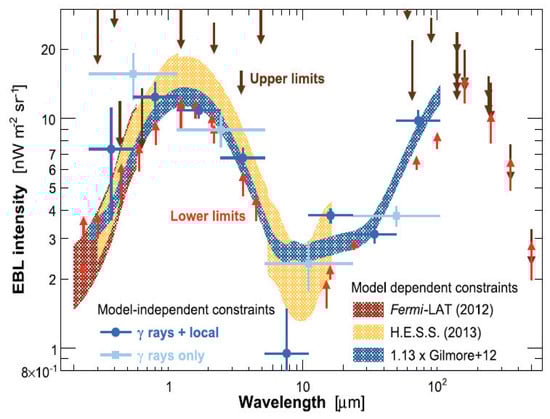 - Abdalla, H.; Abramowski, A.; Aharonian, F.; Benkhali, F.A.; Akhperjanian, A.G.; Andersson, T.; Angüner, E.O.; Arakawa, M.; Arrieta, M.; Aubert, P.; et al. Measurement of the EBL spectral energy distribution using the VHE γ-ray spectra of HESS blazars. Astron. Astrophys. 2017, 606, A59. [Google Scholar] [CrossRef]