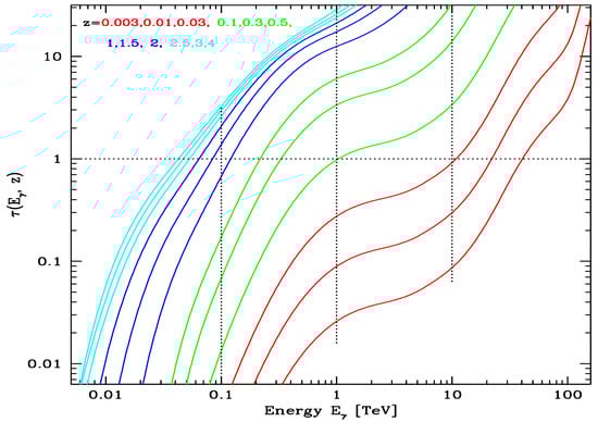 This can be immediately performed assuming an EBL spectral intensity and its cosmic evolution (see Figure 2), complemented with Standard Model treatment of the photon–photon interaction and pair creation process [4].