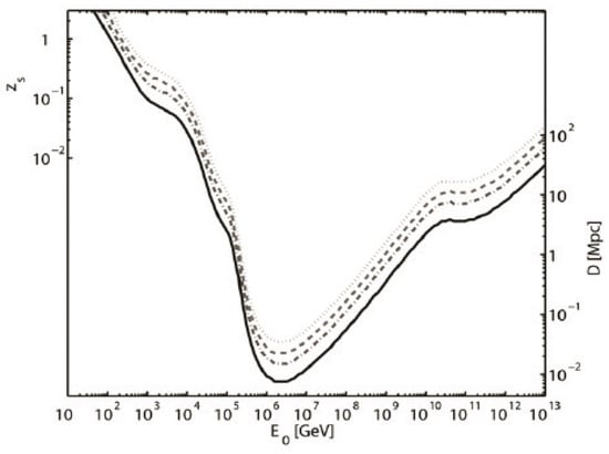 Graphical representation of the global photon–photon opacity. The graph shows the source redshifts at which the optical depth takes fixed values as a function of the observed hard photon energy ; the y-scale on the right side shows the distance in Mpc for nearby sources. The curves from bottom to top correspond to a photon survival probability of = 0.37 (the horizon), = 0.14, = 0.05 and = 0.01. For D > 8 kpc the photon survival probability is larger than 0.37 for any value of . (Kind permission by [88]).
