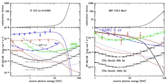 - Tavecchio, F.; Romano, P.; Landoni, M.; Vercellone, S. Putting the hadron beam scenario for extreme blazars to the test with the Cherenkov Telescope Array. Mon. Not. R. Astron. Soc. 2019, 483, 1802–1807. [Google Scholar] [CrossRef]