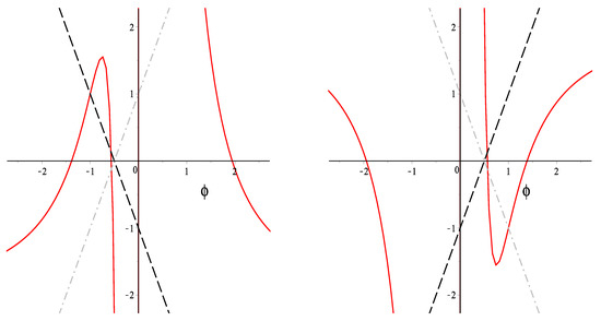 In Figure 2, we present the function that has three roots (red solid curves) and the function for the same values of parameters and and the parameter . One can see that the model has one unstable de Sitter solution or one stable and one unstable de Sitter solutions in dependence on the sign of . The crosses of gray and black lines with axis correspond to switch of gravity and antigravity regimes in the model considered.