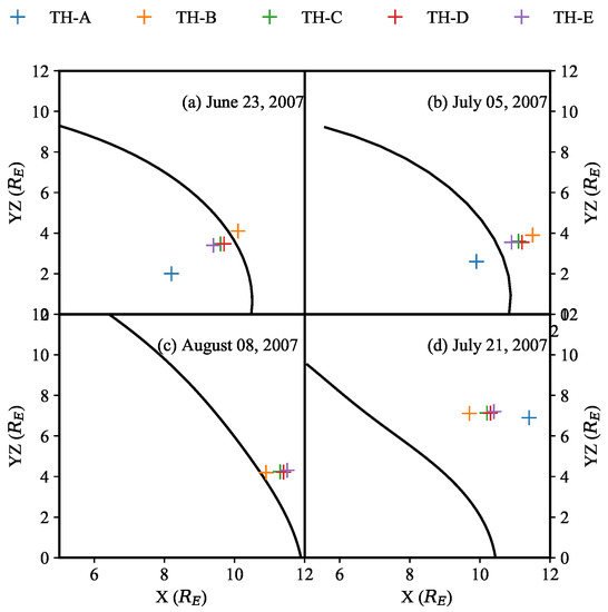 Position of the THEMIS probes according the magnetopause model of Lin et al. [36] (in black) in aberrated-GSM coordinates [37] in units of Earth radii () for the four demonstrative cases. We consistently use the following colour scheme for the rest of the figures: TH-A (blue), TH-B (orange), TH-C (green), TH-D (red), and TH-E (purple).