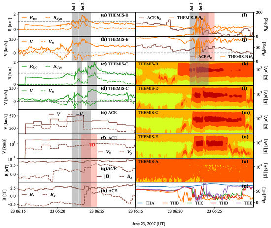 ACE (in the upstream solar wind) and THEMIS (in the magnetosheath and magnetosphere) observations of plasma and magnetic fields for 23 June 2007 (see the text for the details of the definitions and explanations). The panels (a), and (c) represent , and for TH-B, and TH-C respectively; panels (b) and (d) represent , and for TH-B and TH-C respectively; (e) (ACE is represented by brown curves in the panels (e–j)). , and its component are represented in (e). The panel (f) shows and in the solar wind; (g) represents and ; (h) the interplanetary magnetic fields and ; (i) the clock angle , and (j) cone angle measured by ACE (brown) and the outermost THEMIS probe (TH-B in this case in orange) respectively. The panels (k–o) show the ion spectra measured in the magnetosphere and magnetosheath by TH-B, TH-D, TH-C, TH-E and TH-A respectively. Panel (p) shows as measured by the five THEMIS probes (using the colour schemes mentioned in the caption of Figure 1). Vertical grey bars indicate two large-scale magnetosheath plasma jets: Jet 1 and Jet 2. Vertical rose bar indicates a tangential discontinuity as can be seen from 06:23 UT to 06:25 UT.