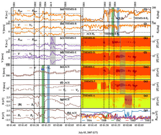 The panels (a–p) represent the same quantities as in Figure 2, but for 5 July 2007 and the panels (a–d) represent the quantities for TH-B and TH-E. The colour scheme is the same as mentioned in Figure 1. The magnetosheath measurements are shown for the above mentioned THEMIS probes, with a time delay for the ACE data of 42 min. Vertical grey dashed lines indicate directional discontinuities (DD1 to DD5) in the upstream solar wind. The discontinuities produce jets in the magnetosheath (Jet 1 to Jet 5), which are observed by the TH-B probe. Vertical grey bars indicate Jet 4 observed by different probes. Vertical green and blue bars indicate the ranges for the analysis of a rotational discontinuity (see the details in the text).