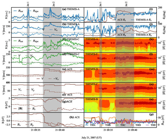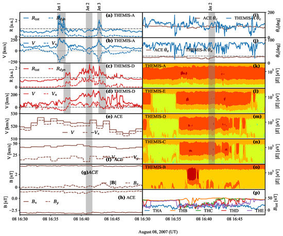 Figure 5 shows a 20 min portion of the long-lasting rIMF interval as an example of a jet generated in the magnetosheath and its interaction with the magnetosphere. On 8 August 2007, from 16:30 UT to 16:50 UT, the chain of THEMIS probes was located near the noon meridian at ∼17° S latitude at , , , and for TH-A, TH-B, TH-C, TH-D and TH-E, respectively. The outermost TH-A probes detected two large-scale plasma jets in the magnetosheath: Jet 1 from 16:36:04 UT to 16:37:26 UT and Jet 3 from 16:42:36 UT to 16:43:20 UT (Figure 5a,b), with total energy ratios of = 2.7 and 2.1, respectively, along with a large component of the plasma velocity normal to the magnetopause, = −250 km/s.