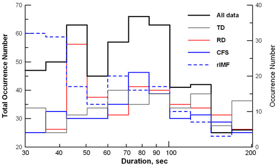 Table 1 shows the statistical distribution of jets originating from different interplanetary structures. We observed that 51% of the jets were mediated by quasi-radial IMF. RDs and TDs produced similar amounts of magnetosheath jets (24% and 25%, respectively). On the other hand, if we considered the CFS structures to be related to discontinuities, then 69% of the jets could be attributed to interplanetary discontinuities and only 31% to rIMF intervals. Thus, at least two-thirds of the large-scale plasma jets were generated in the magnetosheath due to the interaction of interplanetary discontinuities with the magnetosphere. Figure 7 shows a distribution of the jet duration in logarithmic scale. The duration varied from 30 s to more than 3 min and peaked at around 80 s. A secondary maximum can be found around 45 s. The duration of jets generated under rIMF conditions peaked at ∼30 s, which was in good agreement with previous studies [2]. In contrast, the duration of jets related to tangential discontinuities and CFS had a wide maximum between 60 and 100 s. The distribution of the RD-related jets had two maxima: the highest one around 45 s and the second one around 80 s. This implied that the wide maximum duration from 60–100 s was contributed to mainly by jets related to directional discontinuities: TD, RD and CFS. Thus, we suggested that 80 s is a characteristic time of energy conversion during the interaction of interplanetary discontinuities with the magnetosphere. Taking the velocity of the jets to be ∼200–500 km/s, we could estimate the spatial scale of the jets to be ∼3–6∼.