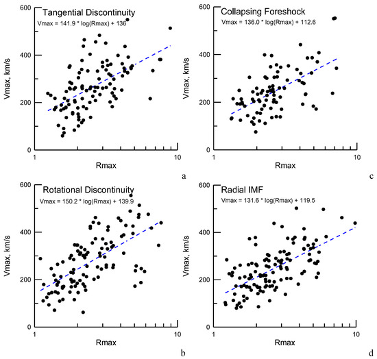 Scatter plots of maximal velocities Vmax of jets versus maximal energy ratio Rmax for different kinds of jets: (a) related to tangential discontinuities, (b) related to rotational discontinuities, (c) related to collapsing foreshock and (d) generated under radial IMF.
