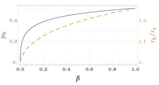 - Photon sphere: The photon sphere—a characterizing feature of black holes [64,65]— is derived from the geodesic Equation (31) by searching for orbits with and . For this, we solve and to first order in . In our case the photon sphere then lies atThis result is identical to the one found in [46].