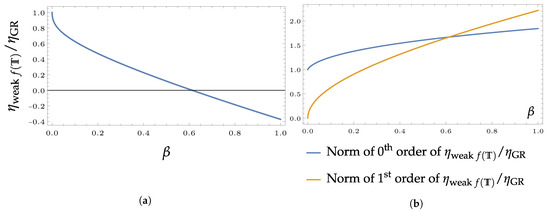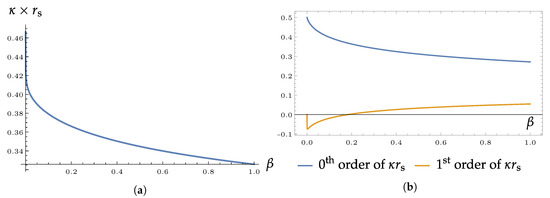 As Figure 2a shows, the surface gravity drops at very small values of very rapidly. However, it is possible to show that the limit is, in fact, well-defined and approaches the general relativistic value . After this initial, sharp drop, the decline remains monotonous with , but does not approach 0 for values of befitting a perturbative interpretation.