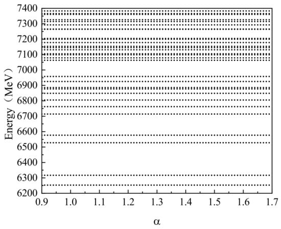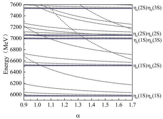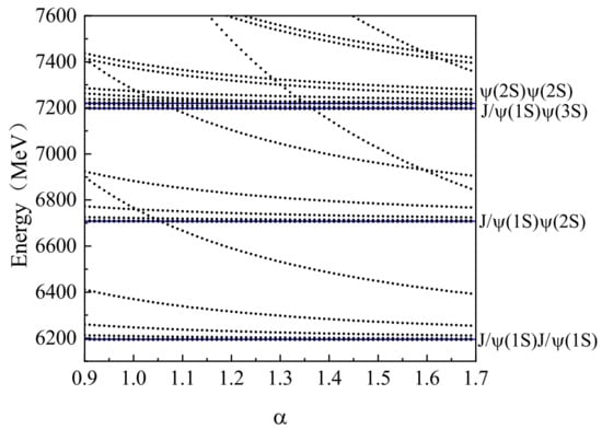 Although there is no bound state for the fully-heavy tetraquark system, resonance states with energies higher than the corresponding thresholds are possible because of the color structures of the system. In the present work, we employ the dedicated real scaling (stabilization) method to determine the genuine resonances. Because the calculation is carried out in a finite space, all the energies obtained are discrete. The bound state has a stable energy in the channel coupling calculation, while the resonance has a quasi-stable energy with increasing space after coupling to the scattering states. The real scaling method has been often used for analyzing electron–atom and electron–molecule scattering [46]. In the present approach, the real scaling method is realized by scaling the Gaussian size parameters in Equation (14) just for the meson-meson structure with the color configuration, i.e., , where takes values between 0.9 and 1.7.