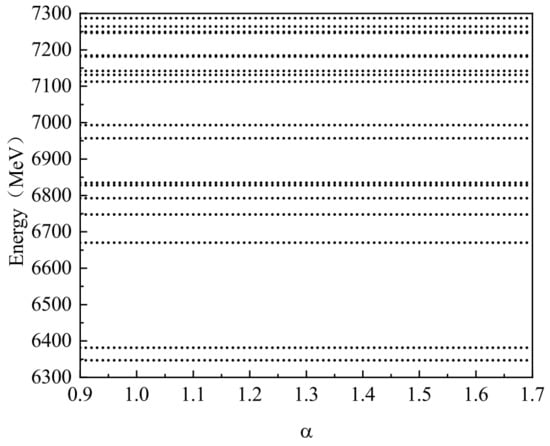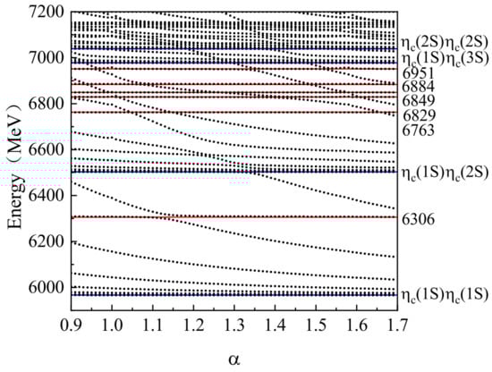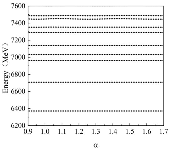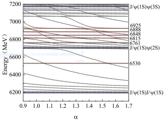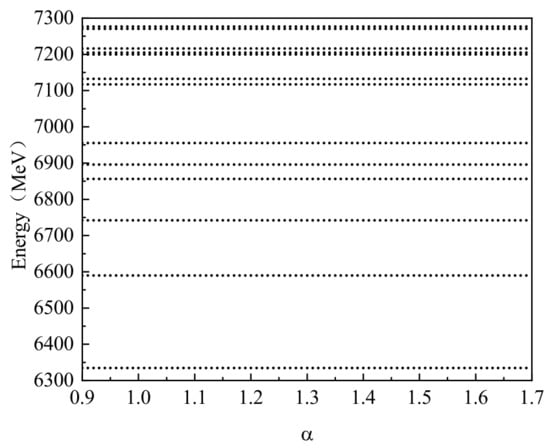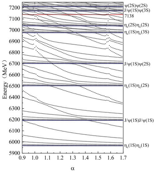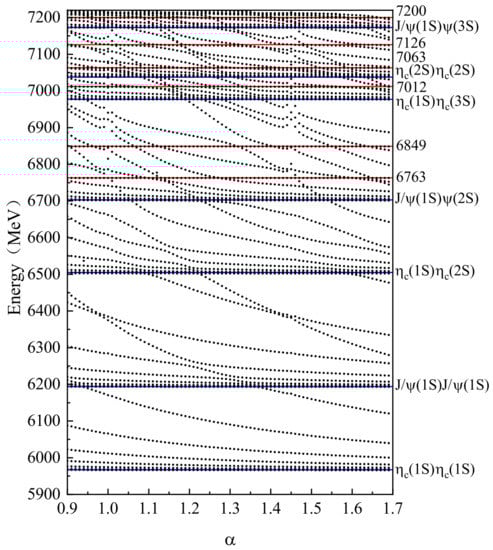 To show the coupling effect, the following calculations were carried out. We first studied the coupling effects between hidden-color channels. In Table 5, the energies for the single hidden-color channel and hidden-color channels coupling are shown. To save space, only the first ten energies are listed. From the table, we can see that the coupling has important effects on the energy spectrum because all the energies of the hidden-color channels lie in the same energy range. For example, hidden-color meson-meson structure has the lowest energy of 6328 MeV, while the diquark–antidiquark structure has a lowest energy of 6344 MeV, and the coupling between structures reduces this energy to 6253 MeV. The coupling results for all hidden-channels are stable against the scaling of space, which is shown in Figure 4. The energy of the lowest state is 6253 MeV. There is another state close to it with an energy of 6316 MeV. At around 6500 MeV, there are two states, and, in the range of 6700–7000 MeV, 8 resonance states appear. Which resonance states can be observed among these states? A calculation for the coupling of the hidden-color channels to the scattering states is required.