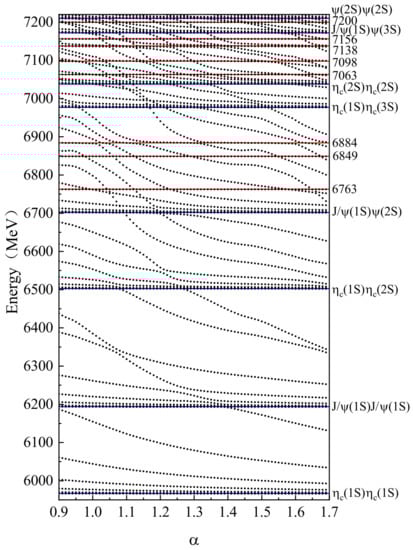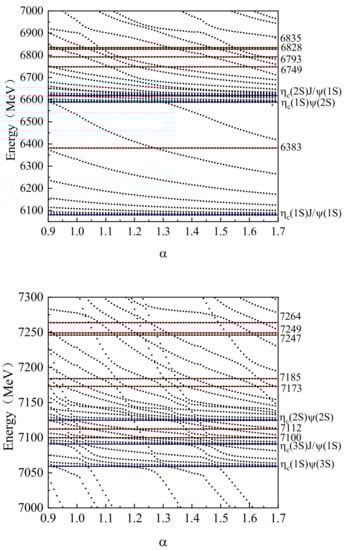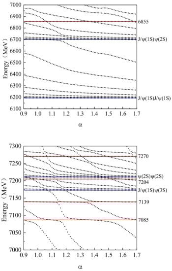 (b) : There are five channels, four with a meson-meson structure and one with a diquark–antidiquark structure. The possible resonances, the results for all hidden-color channels coupling are given in Figure 10. After coupling to the scattering channels, the remaining resonances can be read from Figure 11. From Figure 10, one can see that the energy of the lowest state is 6346 MeV in the hidden-color channels, but this state disappears after coupling the open channel, . However, the second lowest state survives the coupling (see Figure 11), so we obtain a resonance state with an energy of 6383 MeV. There are several resonance states around 6.8 GeV, , , and . There are also several resonances above 7.0 GeV, , , , , , , and . In the meson-meson structure, there are also states with . The calculation shows that there are no resonances below 7.3 GeV, and the results are omitted here to save space.