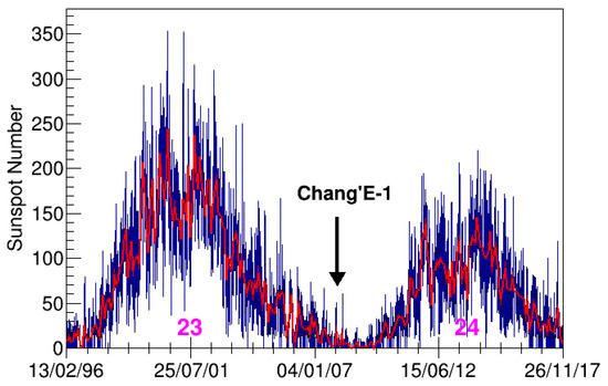 China also constructed and launched Chang’E-1 spacecraft in October 2007 [16,17,18]. Chang’E-1 is a lunar orbiter, its revolution period lasts 2 h, and its orbit is polar. The satellite was equipped with different scientific instruments; in particular, two Solar Wind Ion Detectors (SWIDs) were mounted on the spacecraft. SWID detectors were designed to measure the solar wind ion differential flux. The Chang’E-1 orbiter takes data at the end of solar cycle 23; therefore, the SWIDs are sampling the solar wind in a quiet Sun activity period (see Figure 1). The analysis of the composition of the solar wind improves our understanding of the Sun and allows for improving the models of the cislunar space environment.
