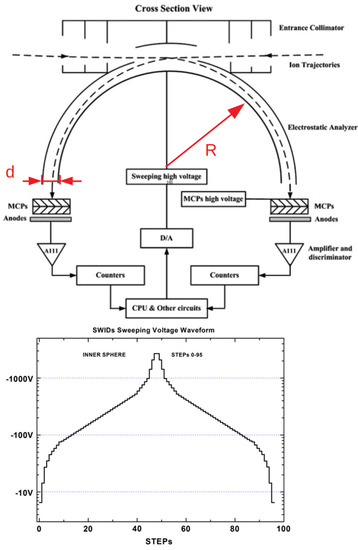 The working principle of the half-sphere electrostatic spectrometer is described in Figure 2). A voltage double−ramp signal made by 48 voltage (−logarithmic) steps is cyclically applied to the inner half-sphere for a duration of 3 s. The positive ion trajectory is deflected by the electrostatic field; thus, considering the analyzer radius R and the gap d, the selected kinetic energy is: .