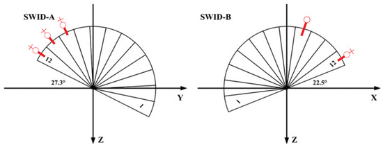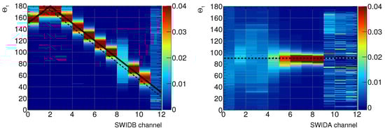 Due to the alignment of the Chang’E-1 orbital plane with SWIDB plane (Figure 3), when the Sun lies in the FoV of one of the SWIDB channel, it will be in the acceptance of all the other SWIDB channels within the same orbit (i.e., in the same Sun activity and global magnetic field status). This allows for the validation of the nominal alignment of SWIDB channels within 7.5 (half channel) of global angular rotation of the SWIDB plane. On the other hand, due to perpendicularity of the SWIDA plane with respect to the SWIDB plane and, due to the limited period of data taking (26 November 2007–7 February 2008 and 15 May 2008–7 July 2008), the Sun was passing in the FoV only for the SWIDA channels #6 to #9. The variations of the Sun activity and of the position of the Moon with respect to Earth’s magnetic field pose additional difficulties in the comparison of the flux measured for different Sun angles with respect to the SWIDA channel response. This allows for the validation of the nominal alignment of SWIDA channels within ∼15 (one channel) of global angular rotation in the SWIDA plane. Finally, from Figure 4, it is also confirmed that SWIDB channel #12 and SWIDA channel #11 and #12 are blocked by the satellite body and that response of SWIDB channel #9 is degraded, as stated in Ref. [20]. On the other hand, flight data indicate that SWIDA channel #10 also seems not usable, with features similar to channels #11 and #12 of SWIDA. A summary of SWIDA and SWIDB channel geometrical configurations and blocked/broken channels is given in Figure 5.