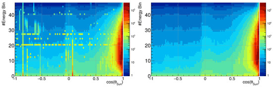 In the left plot of Figure 6, an example of solar wind ion flux measured by channel #8 of the SWIDB detector, as a function of the cosine of the Sun angle, is shown. The vertical axis is the energy bin number. Unfiltered SWID data show specific noisy energy channels (horizontal row) and noisy periods (vertical rows).