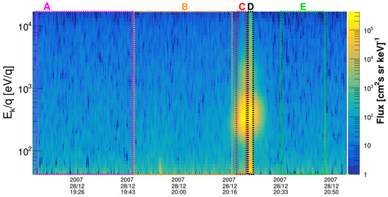 Example of the differential flux measured by channel-8 of SWIDA detector as a function of energy and time for a run of 28 December 2007. The spectrum of the solar wind has a double peak shape due to protons and He ions. The solar wind enters in the FoV of this channel from 8:18 p.m. to 8:25 p.m.; however, from 8:22 p.m. to 8:24 p.m., a large background due to reflected UV is also detected. Five time intervals (A, B, C, D, E) are marked with dashed boxes.