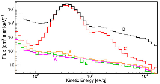 Energy spectrum measured by SWIDA-8 in the five time intervals shown in Figure 7. The spectrum in the A, B, E intervals is relative to intrinsic background of the MCP detector, the spectrum measured in C is the solar wind spectrum superimposed to the intrinsic background of MCP detector, and the spectrum measured in D has a larger background due to the contribution of UV light reflected within the SWIDA-8 channel down to the MCP detector.