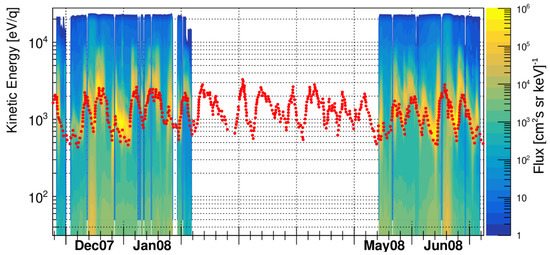 Solar wind differential flux measured by Chang’E-1 as a function of time and kinetic energy. The time variation of the average kinetic energy are in good correlation with the measured solar wind velocity by ACE (red dots).