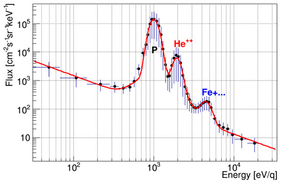 Finally, the solar wind chemical composition is also known to vary with Sun activity. An example of energy distribution measured in our analysis of Chang’E-1 data is shown in Figure 11. The SWID spectrometers cannot identify the particle mass; however, three peaks can be recognized over the spectrometer background.