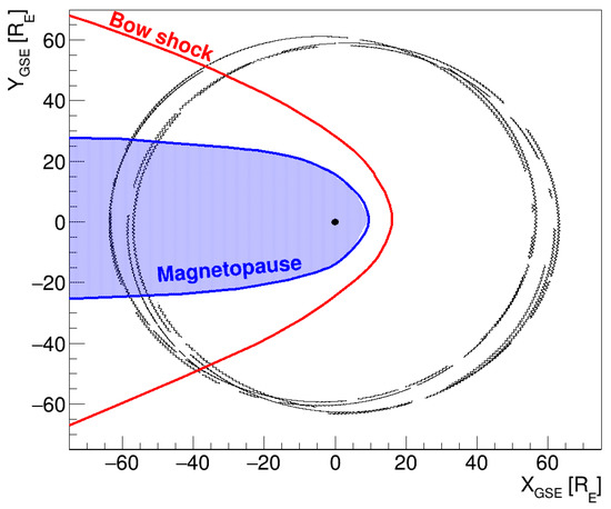 During the Chang’E-1 SWIDs data taking (26 November 2007–7 February 2008 and 15 May 2008–7 July 2008), the Moon experiences four complete passages within the tail of Earth’s magnetic field; this is shown in Figure 13 where the projection of the orbit of Chang’E-1 satellite is shown in Geocentric Solar Ecliptic (GSE) coordinates. Figure 13 also shows the approximated position of the bow shock [28] and magnetopause [29].
