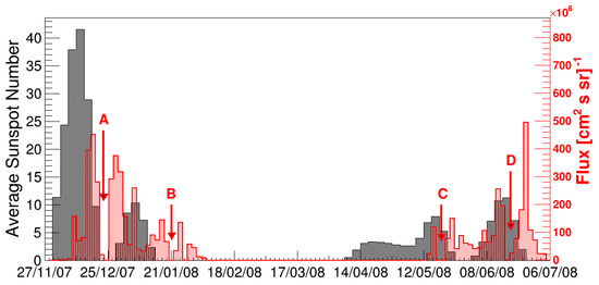 Finally, the comparison of the integrated solar wind flux measured in our analysis of Chang’E-1 data (red filed) with the average sunspot number measured in the same period (black filled) is shown in Figure 15. Similarly to what is shown in Figure 14, Figure 15 also indicates a strong drop of the measured flux in the periods marked as A, B, C, D when the Moon is passing within the magnetopause.