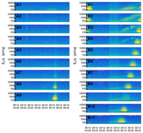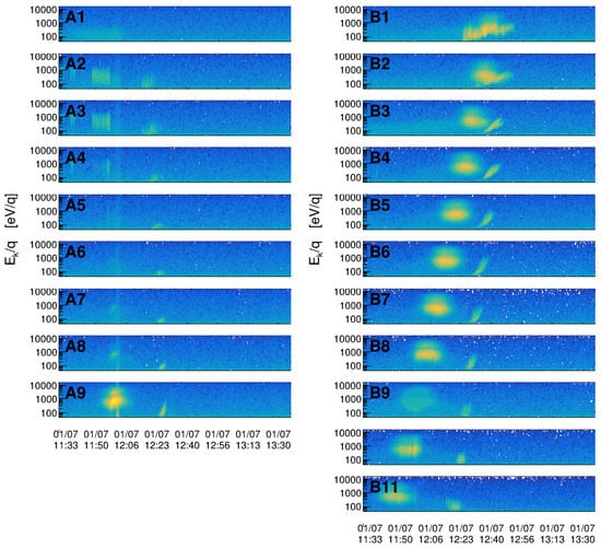 Solar wind flux measured as a function of energy and time for a run of 1 July 2008. Measurements of SWIDA and SWIDB channels are labeled A1 to A9 and B1 to B11, respectively. In this case, the secondary stream of particles is characterized by a kinetic energy smaller with respect to the one of solar wind.