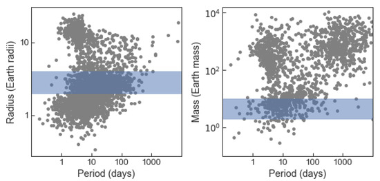 The known population of exoplanets with the sub Neptune exoplanets marked by the blue bands. The left (right) panel shows the planet radius (mass) in Earth radii (mass) versus orbital period in days. The blue-shaded region marks the typically adopted sub Neptune defining range of approximately 1.6–4 Earth radii (2 to 10 Earth masses). Only confirmed exoplanets are plotted, hence the data shown reflect selection and detection biases. Each panel shows slightly different samples of exoplanets because some planets have only mass or radius measured and not both. Data from Exoplanet archive (https://exoplanetarchive.ipac.caltech.edu/ (accessed on 28 January 2021).