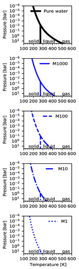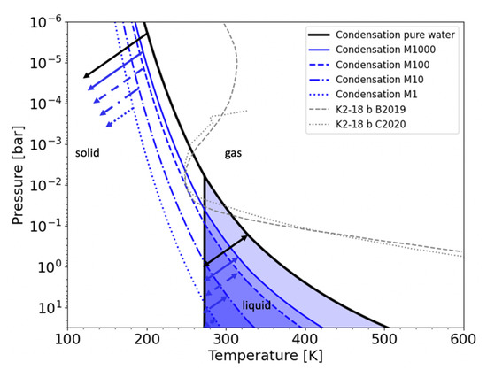 Water equilibrium phase diagram showing condensation curves for varying water content. The x axis shows temperature and the y axis shows pressure. The black solid line is the condensation for pure water and the blue lines show condensation for atmospheres of different water content (corresponding to the different panels in Figure 3). Metallicity values translate to approximate water vapor content in a 90% H2 and 10% He atmosphere as follows: M1 (solar metallicity) ~ 0.00078; M10 (10× solar) ~ 0.0077; M100 (100× solar) ~ 0.068; M1000 (1000× solar) ~ 0.16. The arrows in the top left show that to the left of each condensation curve water will be in solid form (ice). The blue-shaded regions indicate the temperatures and pressures where water is in the liquid phase for different water content; the double-headed arrows indicate the liquid water range for different values of atmospheric water content. The black vertical line is the liquid/solid phase boundary common to all values of atmospheric water content, because the freezing temperature for water (273 K) is insensitive to pressure for pressures less than approximately 100 bar. The grey dashed and dotted lines show two different K2-18 b atmosphere profiles that fit Hubble data (from [12,49]), both are for atmospheric metallicities of 100× solar (B2019 is the Bond albedo = 0.3 case from [12] and C2020 is from [51]). Because the grey curves intersect the condensation curve for an atmosphere with metallicity of 100 (blue dashed curve) but do not pass through the liquid water region for an atmosphere metallicity of 100, the models show that water will be in ice and not liquid form. To support liquid water clouds, planet atmosphere temperature–pressure profiles must pass through the liquid water region of the phase diagram.