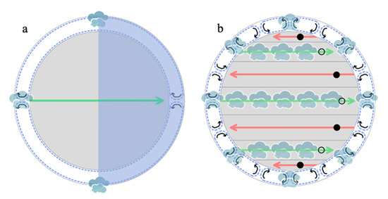 Qualitative illustration of the atmospheric circulation for and preferential location of cloud formation on slowly rotating and rapidly rotating sub Neptunes (not to scale). (a) A tidally-locked temperate sub Neptune will be slowly rotating and is expected to have a single planet-wide circulation cell with a symmetric day–night circulation moving away from the substellar point (left side of the figure at the base of the green arrow) and returning at a lower level after downwelling at the night side. Clouds may form at the dayside (left side of the figure) and/or terminator, depending on a complex interplay of a variety of factors and based on simulations [51]. The blue-shaded region indicates the permanent planet night side. Adapted from [51]’s description of K2-18 b. (b) A rapidly rotating planet is expected to have multiple latitudinal cells, with alternating wind direction (indicated by arrows). The latitudinal cells may also alternate between upwelling regions (indicated by open circles with dots) with clouds and downwelling regions (indicated by filled circles) that are cloud free, though this picture will be complicated by other dynamics. A key takeaway is both the slowly and rapidly rotating planets likely have a return atmosphere flow at a low atmosphere altitude; if the temperature is cool enough life can survive indefinitely.